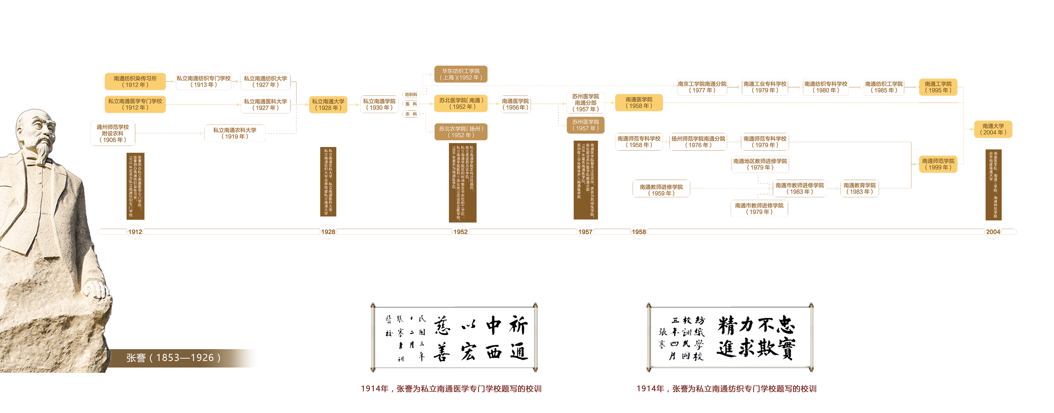 1912年3月,张謇借南通城南庙宇籍仙观创办私立南通医学专门学校,这是国人最早创办的私立高等医学院校之一,是我国民办高等医学教育本土化的发端。1912年4月,张謇在南通唐闸借资生冶厂创办南通纺织染传传习所,同年秋改称南通纺织学校,次年定名为南通纺织专门学校。这是中国最早独立设置的纺织专科院校。张謇(1853-1926),字季直,号啬庵,清末状元。中国近代著名爱国实业家、教育家,立宪运动领袖。辛亥革命后,促进民主共和,拓展地方自治。1853年出生于江苏海门常乐镇一个小瓷商兼治小农的家庭。1868年考中秀才,1885年顺天府乡试考中举人,1894年考中恩科状元,授翰林院修撰。1904年,清政府赏三品衔,任商部头等顾问官。1909年当选为江苏咨议局议长。1911年当选为中央教育会长、江苏临时议会议长,同年任江苏两淮盐政总理。1912年任中华民国临时政府实业总长。1913年任民国北京政府农商总长,1914年任民国北京政府全国水利总局总裁。曾应聘主持赣榆选青书院(1888)、崇明瀛洲书院(1893)、安庆经古书院(1896)、江宁文正书院(1896)等传统教育机构。1912年张謇与其兄创办了私立