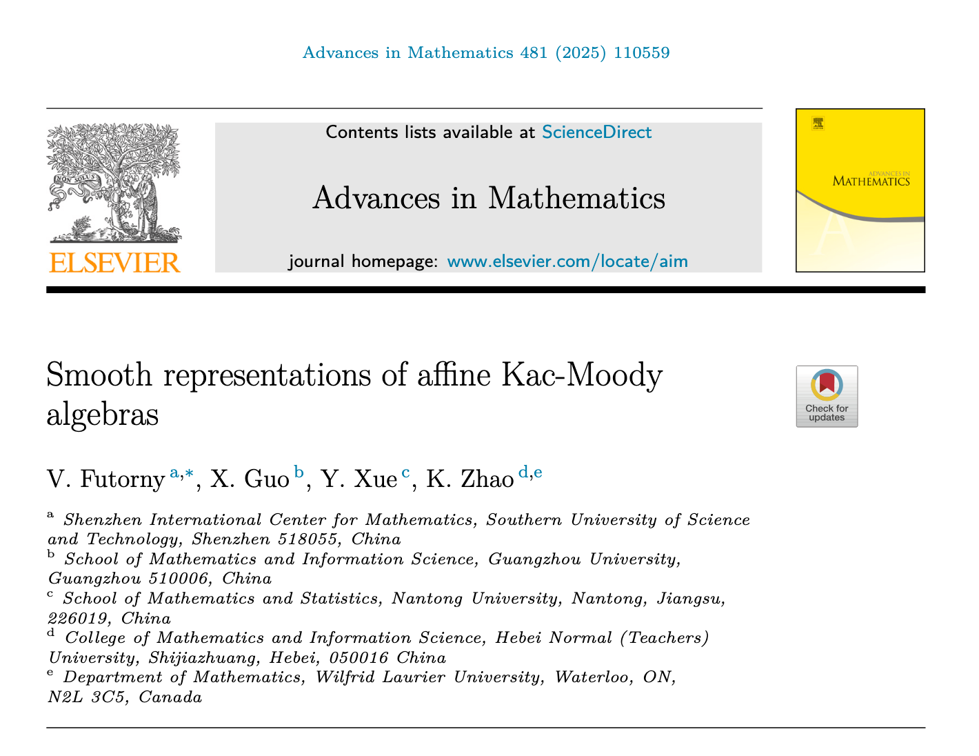 近日,数学与统计学院薛耀辉博士在顶尖综合性数学期刊《Advances in Mathematics》上发表题为 “Smooth representations of affine Kac-Moody algebras” (仿射Kac-Moody代数上的光滑表示)的论文。该论文与南方科技大学Vyacheslav Futorny教授,广州大学郭向前教授和Wilfrid Laurier大学赵开明教授合作完成。