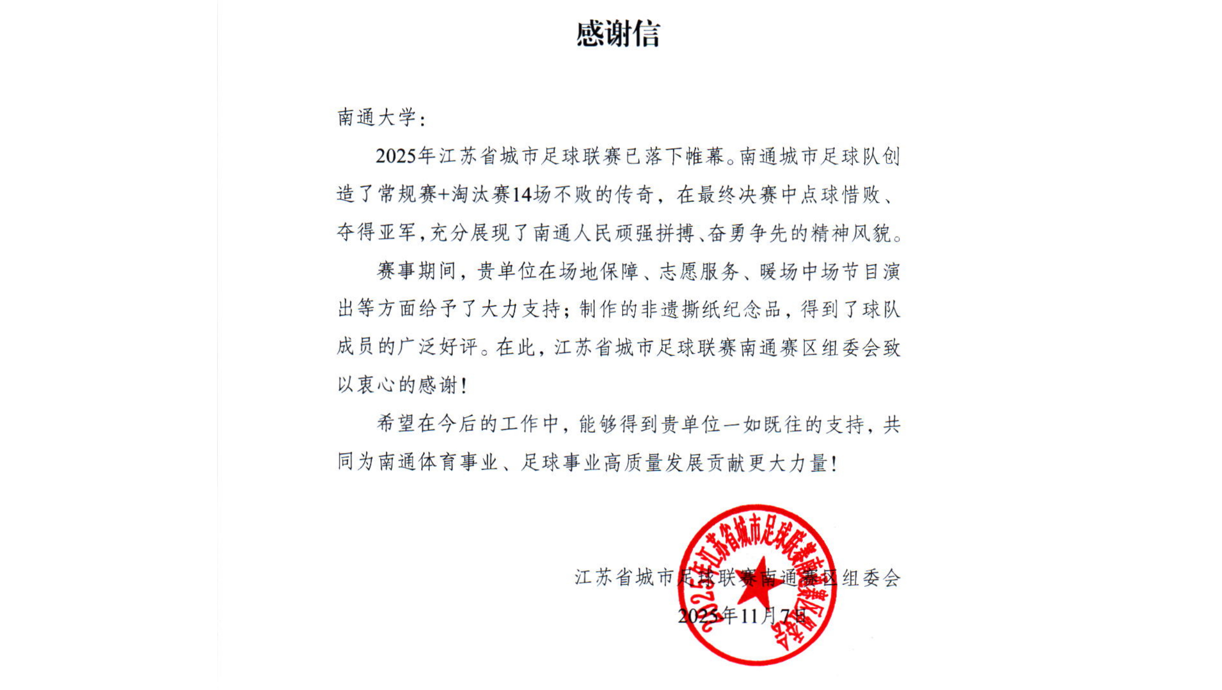 近日,江苏省城市足球联赛南通赛区组委会向鸭脖发来感谢信,对学校在赛事期间提供的全方位支持致以诚挚谢意。
