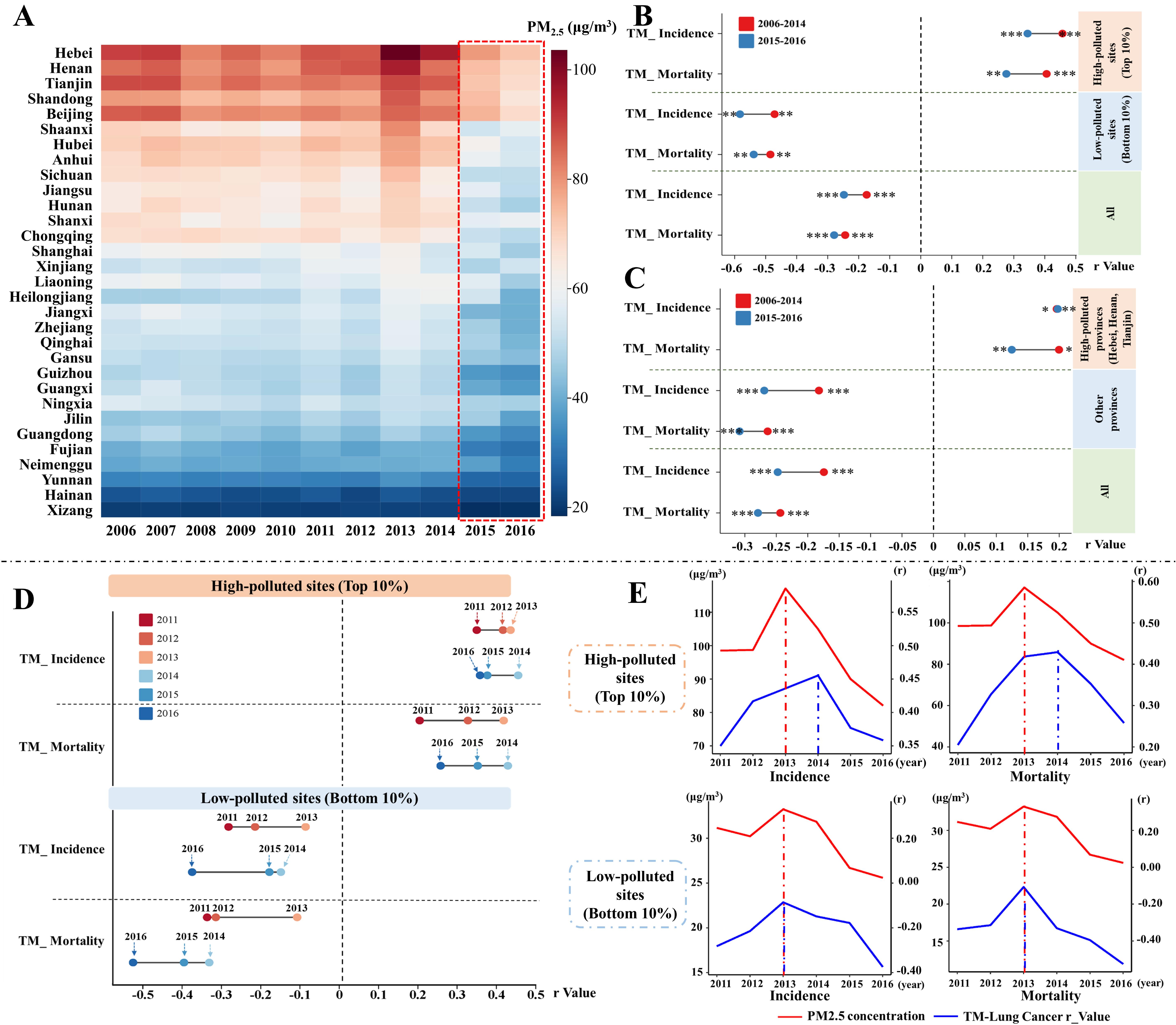 研究团队联合北京大学、复旦大学、中国地质大学、江苏省人民医院等,整合了全国537个监测点(覆盖31个省、自治区、直辖市)的长期肺癌监测数据、气象再分析数据及高分辨率大气颗粒物数据,综合运用多种统计分析方法系统解析了气候因素联合大气污染物对肺癌发生发展的影响。研究发现温度与女性肺癌发病/死亡呈显著负相关,但在大气污染严重区域,此关联逆转成显著正相关。研究证实,自我国《大气污染防治行动计划》2013年实施后,高污染地区温度与肺癌的正向关联明显减弱,为“控污—气候适应”协同治理提供了科学依据。研究团队还从遗传与表观遗传角度揭示非吸烟肺腺癌的发生机制,发现遗传位点rs939408通过调控LRRC2基因的甲基化影响其表达,进而降低非吸烟人群肺腺癌发生风险。功能实验证实LRRC2具有抑制肺癌恶性表型的作用。结合影像组学与机器学习模型进一步分析,发现LRRC2低表达与肿瘤转移及不良预后存在显著关联。该研究揭示了遗传与表观遗传共同调控肺腺癌易感性的全新机制,研究成果有望推动肺腺癌的遗传病因学研究,为辅助高危人群精准识别提供更多生物标志物支持。