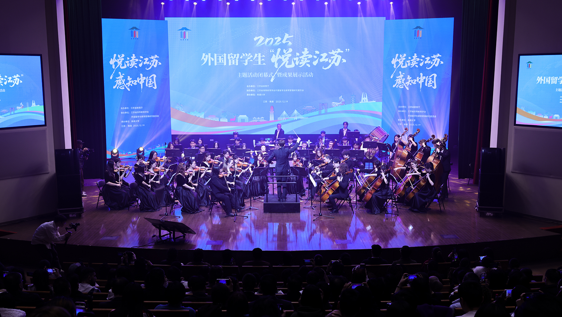 活动现场亮点纷呈,氛围热烈。鸭脖国际交响乐团先后奏响《红旗颂》《卡门序曲》,意大利籍首席指挥Roberto Fiore带领包含法国籍、乌兹别克斯坦籍师生在内的56名乐团成员,以跌宕起伏的旋律将中外音乐元素进行完美融合,赢得一致好评。2023—2025“悦读江苏”活动回顾视频《跨越山海的“悦读”之约》串联起江苏13座城市行走活动的精彩瞬间。优秀创意作品展示视频集中呈现了留学生文学创作、绘画、书法、摄影和短视频等原创作品,凝聚了留学生对江苏的深刻感悟与真挚热爱。