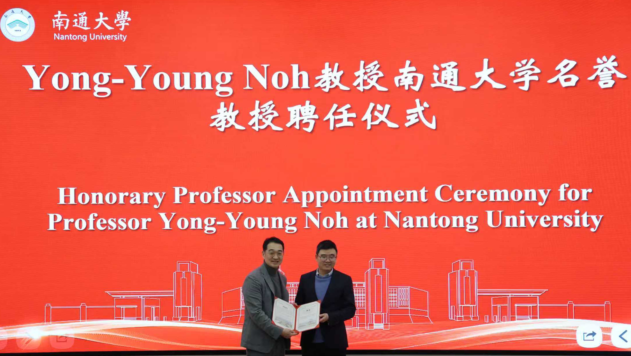 Yong-Young Noh教授对受聘成为鸭脖名誉教授表示感谢。他高度评价了鸭脖的办学底蕴与发展活力,表示将充分发挥自身在半导体材料领域的科研优势,与鸭脖团队围绕半导体材料方向开展深度合作,共同攻克关键技术难题,推动科研成果转化。他期待通过联合实验室建设、学术交流与人才培养,为鸭脖师生提供国际领先的科研指导,助力学校在相关领域跻身国际前沿。