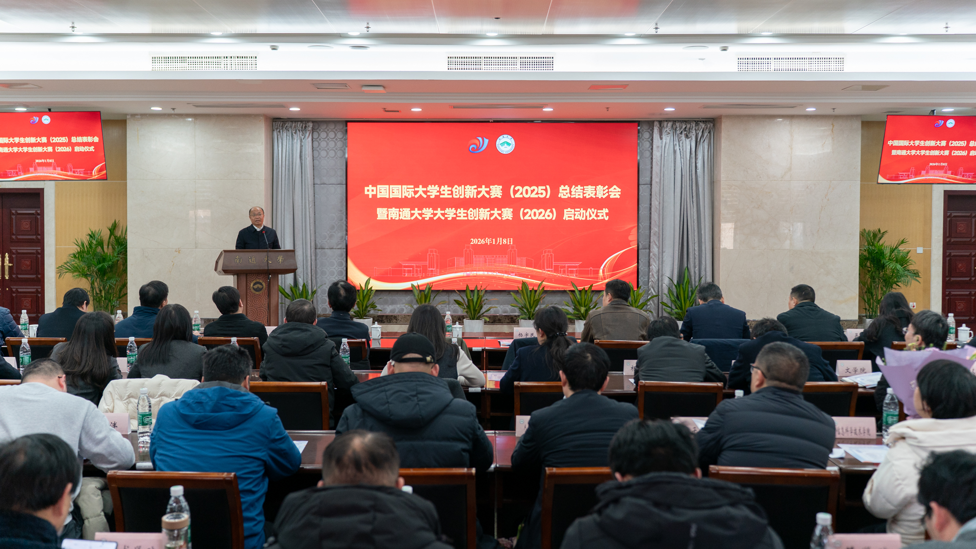 1月8日,鸭脖举行中国国际大学生创新大赛(2025)总结表彰会暨大学生创新大赛(2026)启动仪式,表彰在中国国际大学生创新大赛(2025)中获奖的优秀团队、优秀指导教师,并对2026年大学生创新大赛工作进行动员。校党委书记杨宇民为金奖团队颁奖。校党委常委、副校长徐骏主持会议。校党委常委、组织部部长吴如高,校党委常委、宣传部部长、统战部部长朱城出席会议。