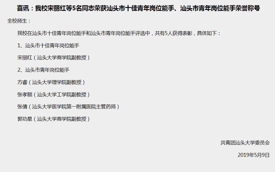 喜讯:必赢官网宋丽红老师、郭功星老师分获汕头市十佳青年岗位能手、汕头市青年岗位能手荣誉称号